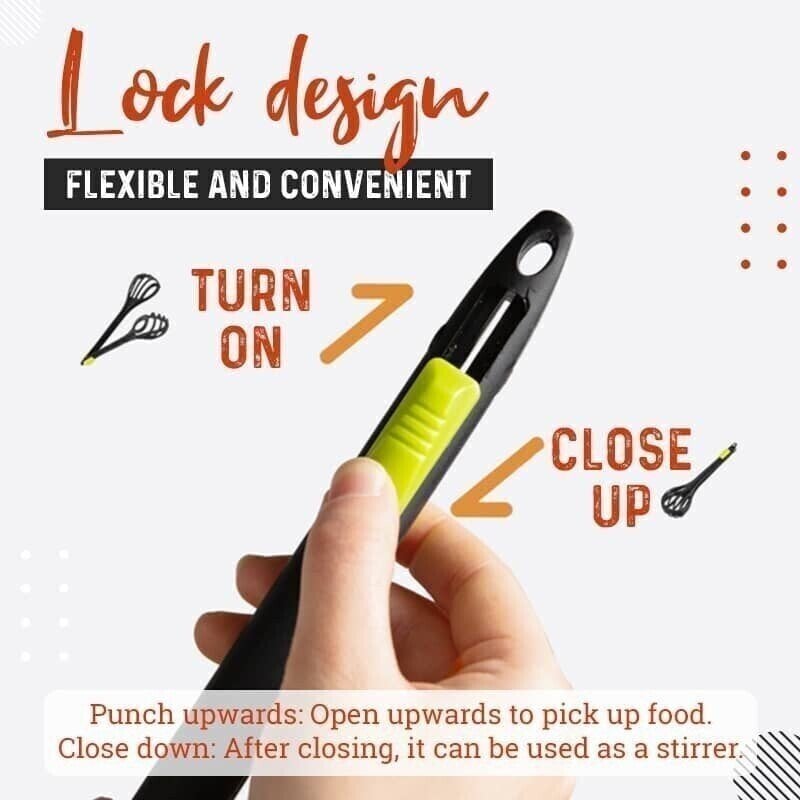 - ćErgonomic & Practical Designć-Ā One-key opening and closing designĀ make the whole cooking process easier and safer, it canĀ prevent accidental falling (like eggs) efficiently.Ā And the excellent eight-line design makes the mixing better and faster for liquid foods. This Multiple-In-1 kitchen tongs can meet almost all your cooking needs!